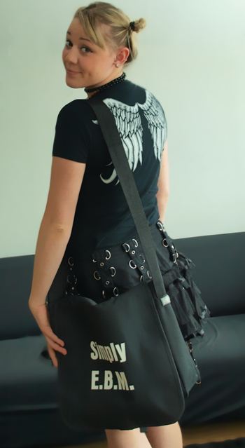Here are some pictures where you can see the amazing "Simply E.B.M." messenger bag in life and how it can greatly match your goth/ebm/alternative clothing.